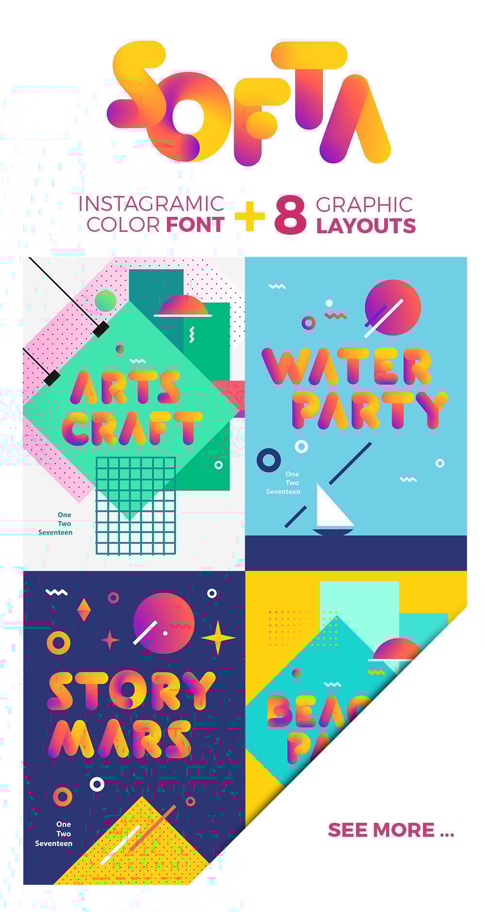 A typography inspired by Instagram logo colors. SOFTA is soft, colorful, lettering typography for writing covers, headlines, slogans, logos, short texts. Typography consists of prepared Adobe Illustrator and Adobe Photoshop files. Also with easy possibility to modify vector files.